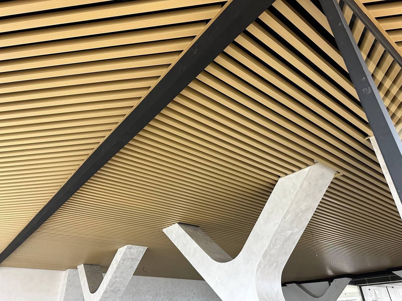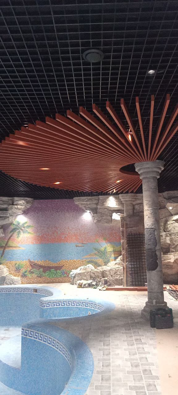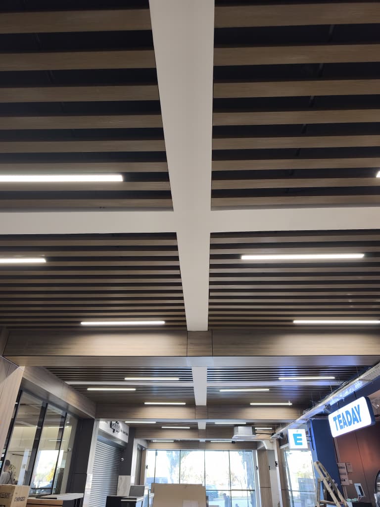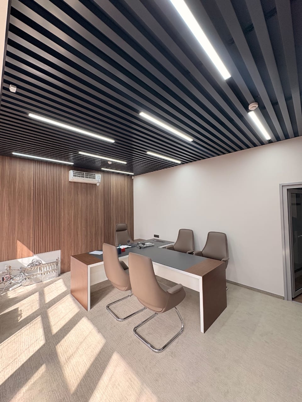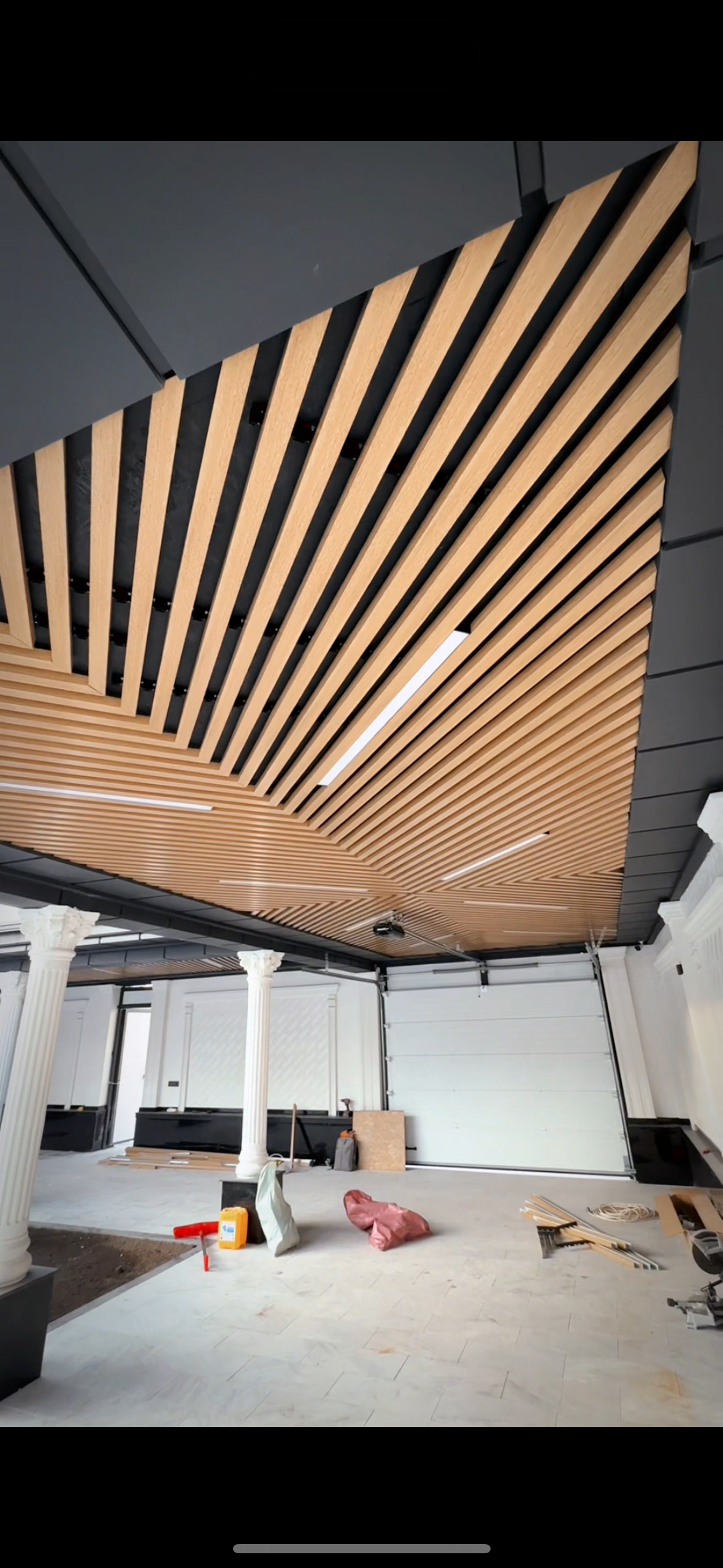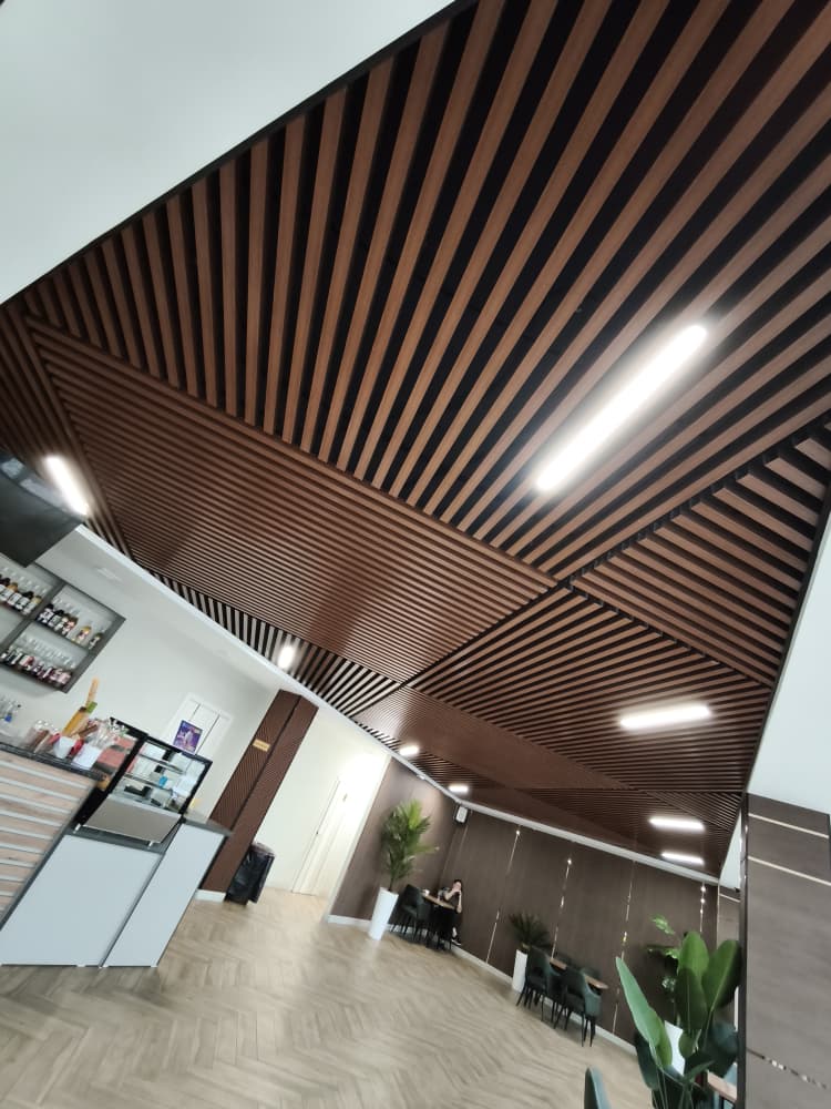 Реечные потолки — это подвесные потолочные системы, состоящие из узких длинных панелей (реек), которые крепятся к металлическому каркасу под основным потолком. Чаще всего их делают из алюминия или стали с защитным покрытием.