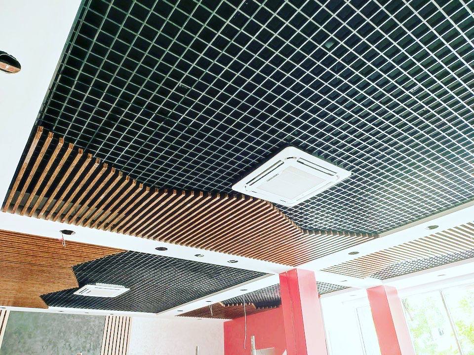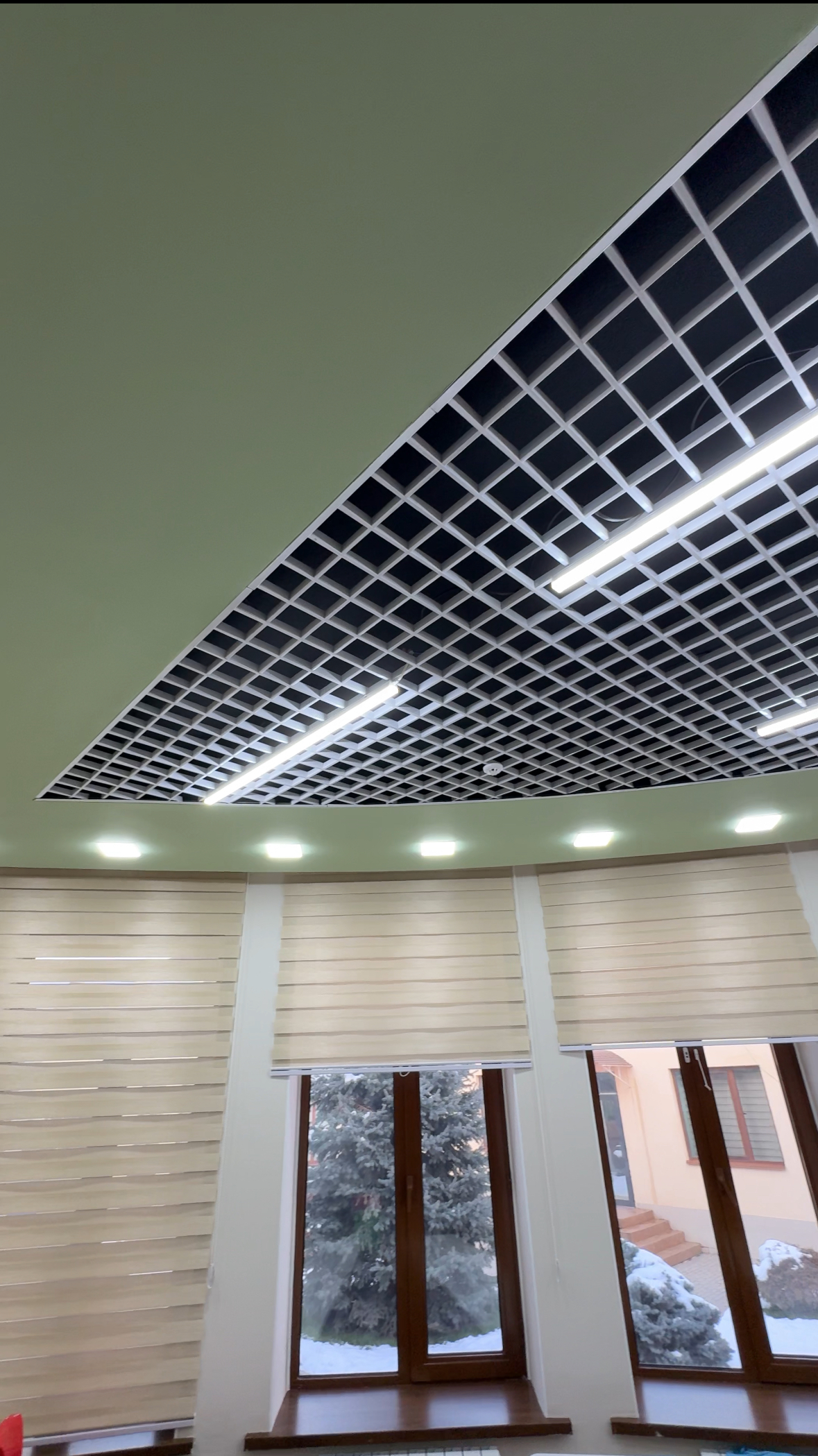 Грильято потолки — это подвесные потолочные системы в виде решётки (с ячейками), которые крепятся к металлическому каркасу под основным потолком. Чаще всего изготавливаются из алюминия и используются в современных интерьерах (офисы, ТЦ, рестораны).
